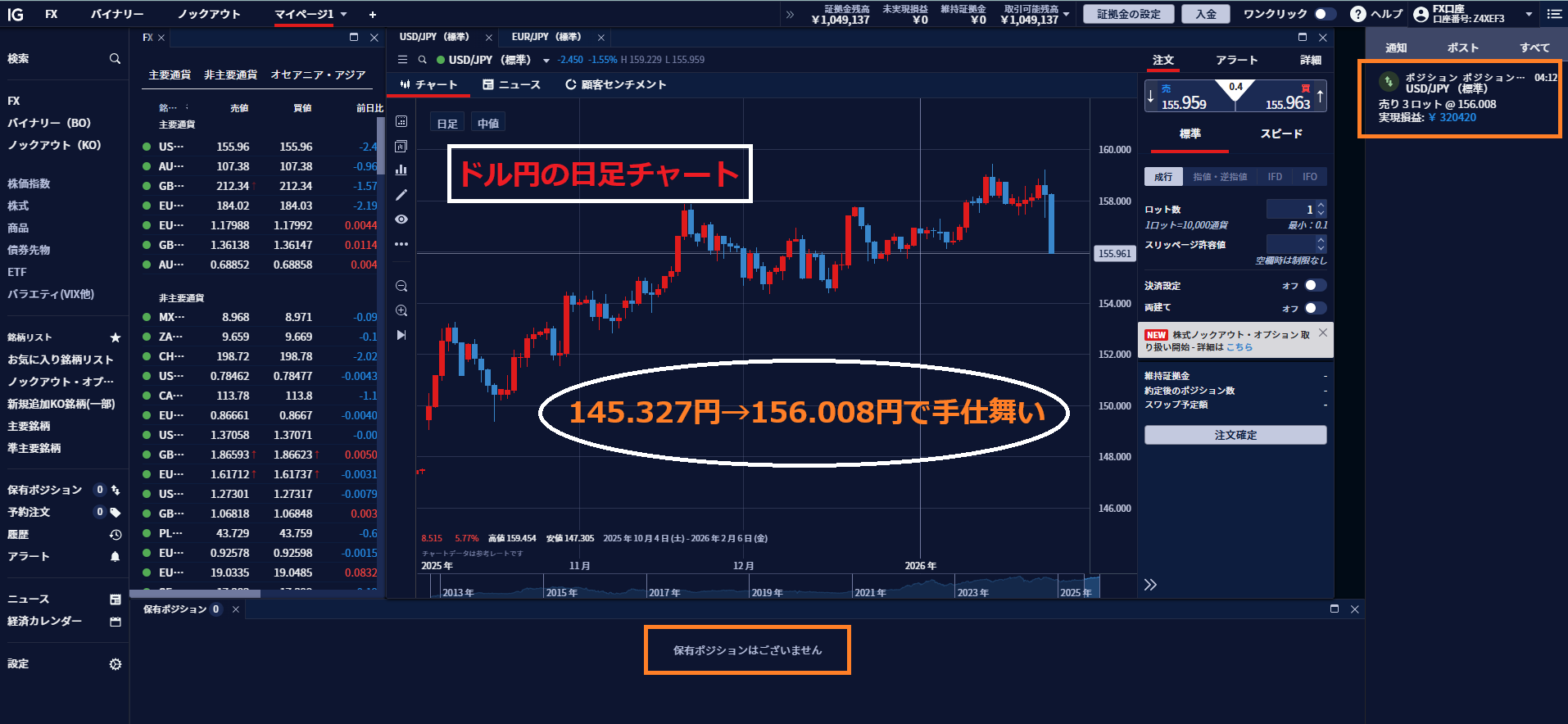 週末の一連の動きを受けて、私のドル円ロング@145.327円のポジションは156.008円で精算しました。利益は約32万円。160円突破を期待していましたが、これまでと違い米当局が支援する(実際にするかどうかは不明)との思惑はドル円をかなり押し下げる要因になりそうです。衆院も解散し選挙戦が始まったことで、日本サイドもこれ以上の円安は容認できないとみて、「気合」を入れて対応してくる可能性もあり、ドル円はしばらく様子見したいと思います。