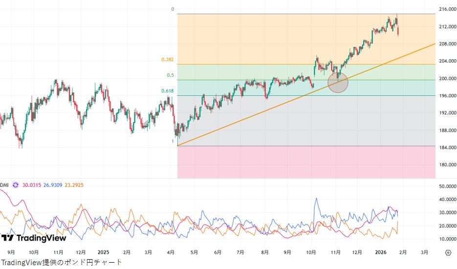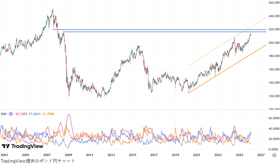 ポンド円の週足分析:上昇トレンドが継続、次は215円台や219円台が上値目標に