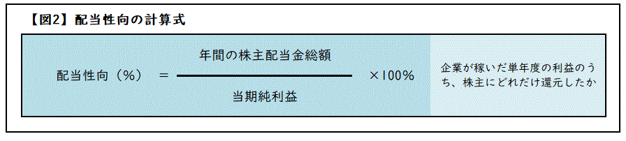 配当性向は、「事業の利益のうち、どれだけを株主に分配するか」の割合です。【図2】は配当性向の計算式です。