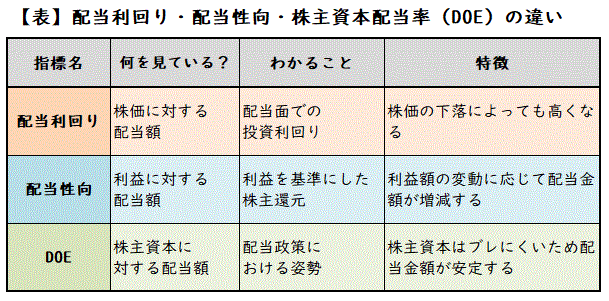株主資本は、株主の出資分に事業で積み上げてきた利益を加えたもので、DOEは利益の蓄積からの配分です。一般的に株主資本は大きく変動するものではありませんから、単年度の利益が落ちたとしても配当金の額を保ちやすいという特徴があります。