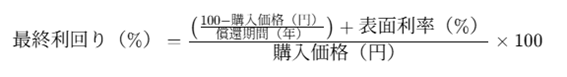 元本10万円の損と利息14万円を合算すると4万円の利益になりますので、投資した結果利益を得られたということになりますね。ちなみに、債券を買って満期まで保有した場合の利回り(最終利回り)は以下の計算式となります。