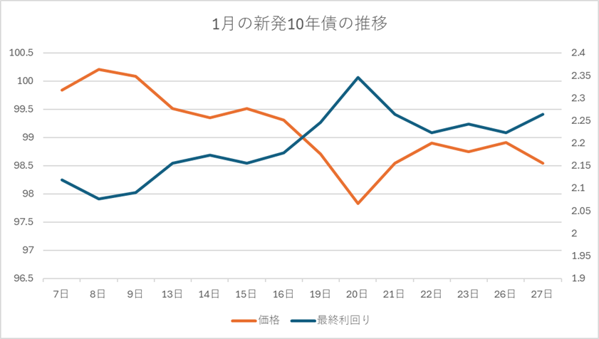 発行日以降に日本の長期金利が急上昇したことが話題となりましたので、その間、この新発国債はどのような推移となっているのでしょうか。チャートにすると以下のようになります。