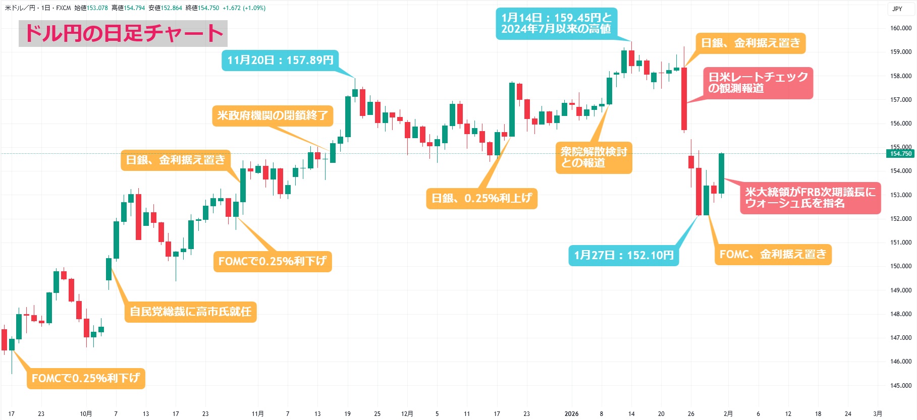 週末にはトランプ米大統領が米連邦準備理事会(FRB)の次期議長に、議長候補の中でも相対的にタカ派とされるケビン・ウォーシュ氏を指名すると正式に発表。市場の想定ほど利下げが進まないとの見方から、全般ドル買いが進みました。また、財務省は昨年12月29日-1月28日に外国為替市場で為替介入を実施しなかったことを明らかに。今回発表された介入実績で実弾が投入されていなかったことが判明したことで、円売りも出やすい地合いとなりました。これらを受けて、ドル円は週末のNY終盤に154.79円まで値を戻しています。
