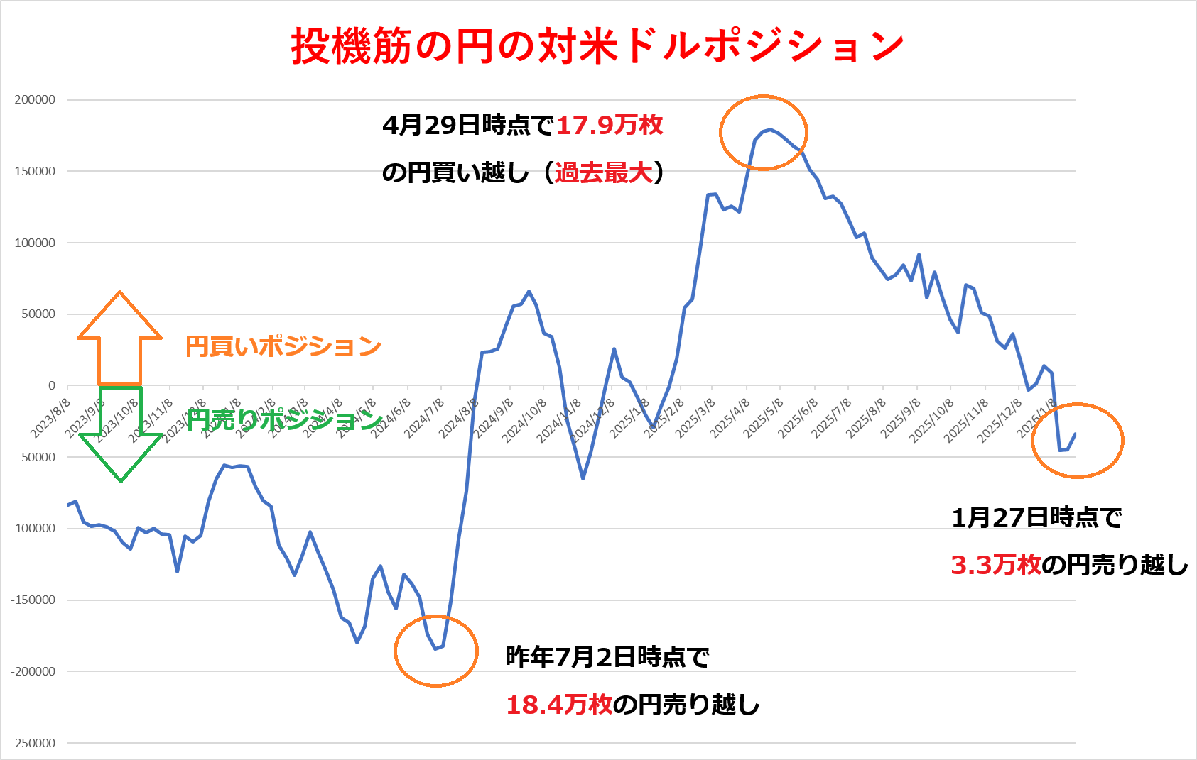 投機筋の円のポジションは昨年7月2日には18万4223枚の円売り越し(ドル円のロング)となり、2007年6月(18万8077枚)以来の高水準を記録していましたが、そのあとは一転して円買いポジションを構築する動きが優勢となり、4月29日には17万9212枚と過去最大を更新しています。ただ、それ以降はその動きが反転し、再び円売りポジションに。「レートチェック」報道から円高が進んだにもかかわらず、依然として1月27日時点では円売りポジションが維持されています。
