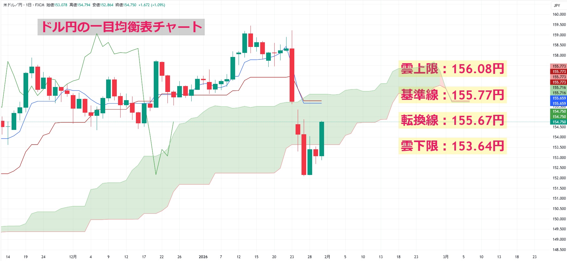 ドル円の一目均衡表チャートを見ると、週末の終値(154.78円)で再び雲の中に入り込みました。雲上限(156.08円)や基準線(155.77円)、転換線(155.67円)は下回っていますが、雲下限(153.64円)は上回っています。