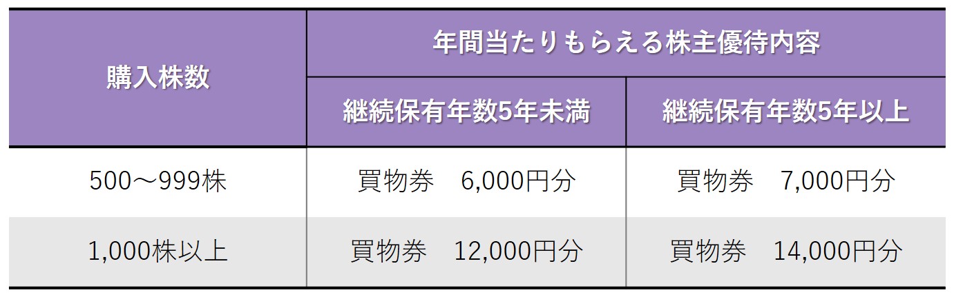 保有株数および保有年数に応じて贈呈される株主優待の内容は、下記の一覧表をご確認ください。