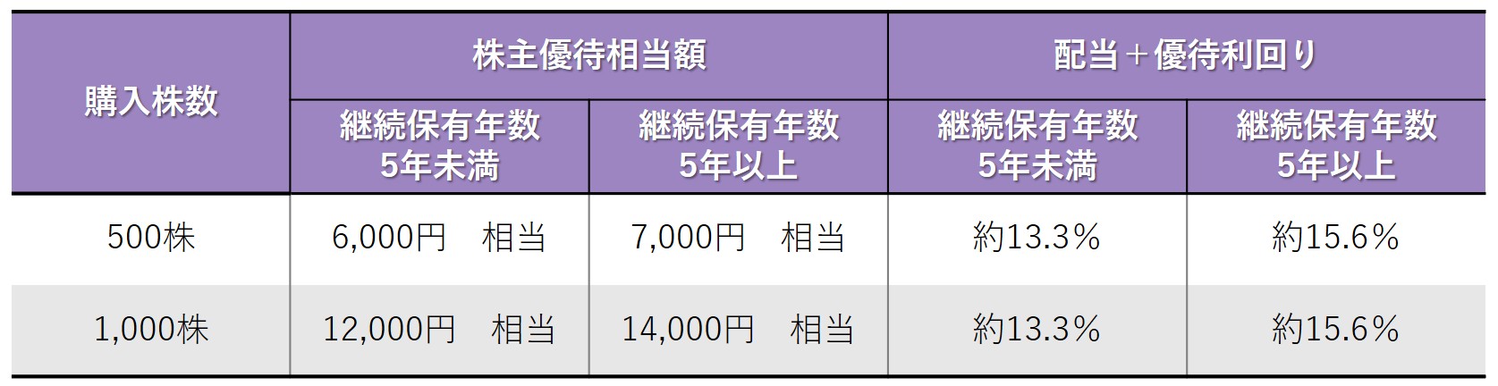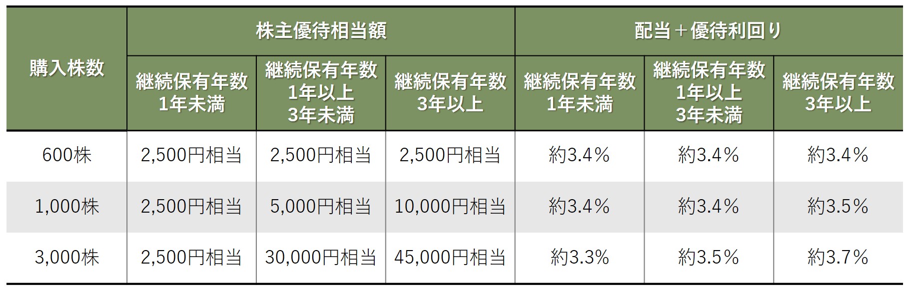 保有株数および保有年数に応じた配当と優待を合わせた利回りの一覧は、下記の表をご参考ください。