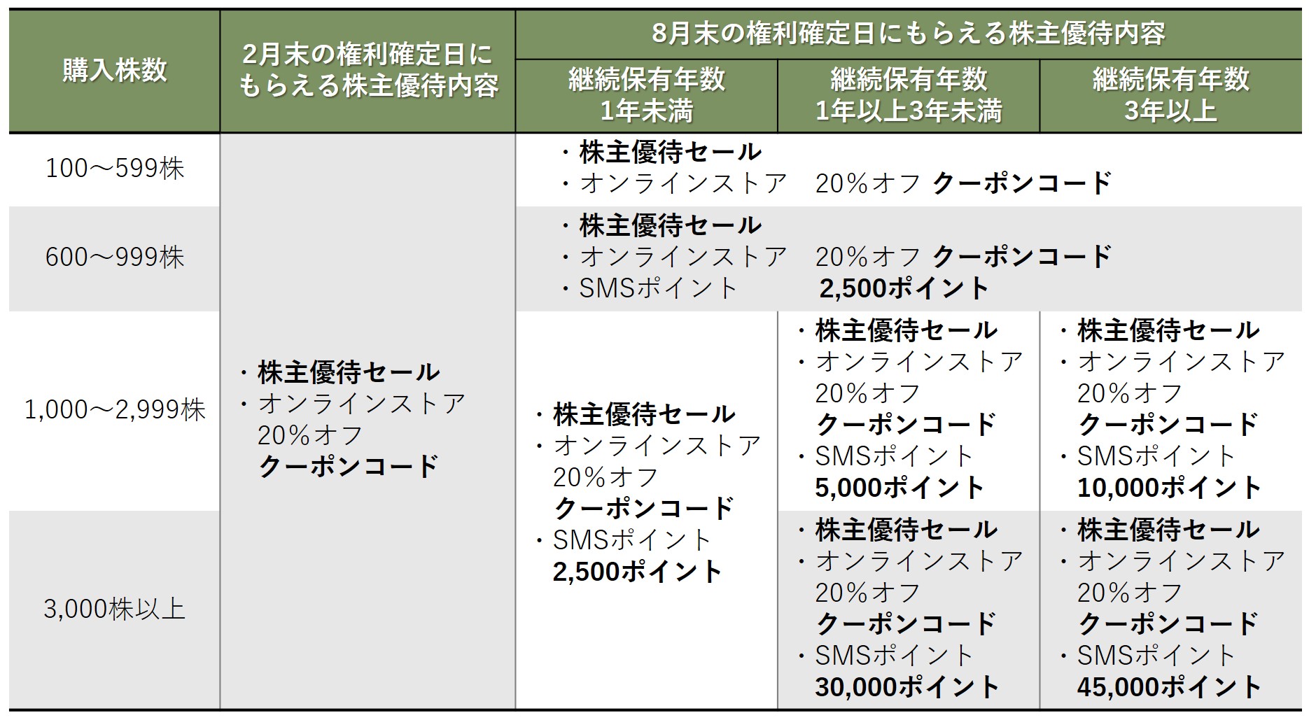 三陽商会の株主優待は、毎年2月末と8月末の権利確定日に、100株以上の株式を保有する株主に対して、保有株数および保有年数に応じて贈呈されます。贈呈される株主優待の内容は、株主優待セールへの招待およびSMSポイントです。