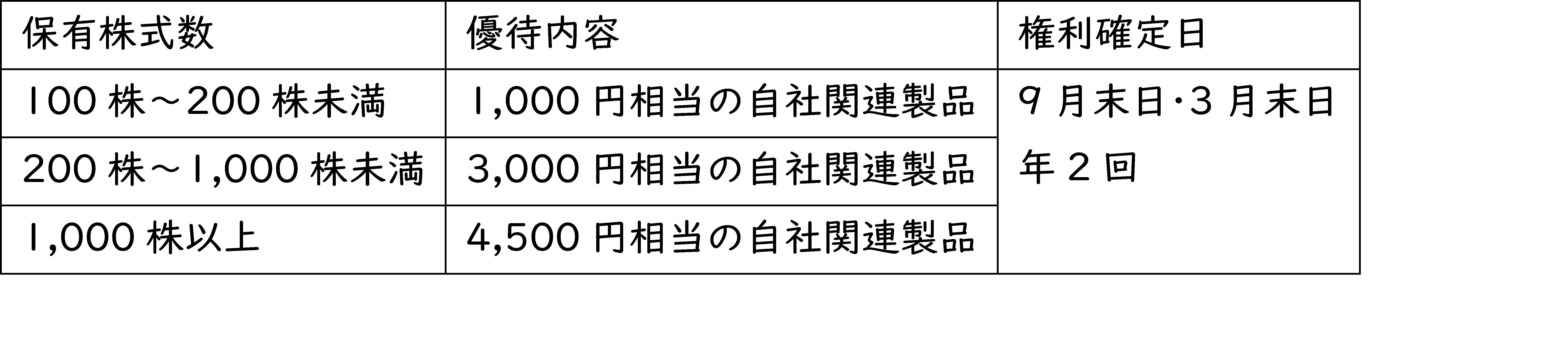 株主優待は、毎年3月末日現在の株主名簿に記載または記録された株主のうち、100株以上を保有の株主に対して実施されています。
