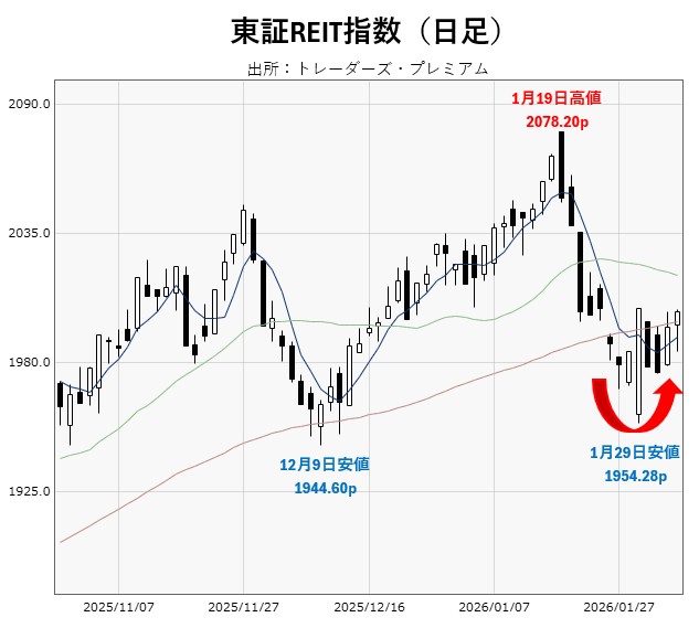 REIT指数の急降下には肝を冷やしましたが、直近安値近辺で買いが入ったことで、下落トレンド入りへの警戒は後退しています。当面は昨年12月安値の1944.60pを「防衛ライン」として意識しつつ、個別銘柄がどこまで戻していけるか、慎重に、かつ期待を持って見守りたい局面です。