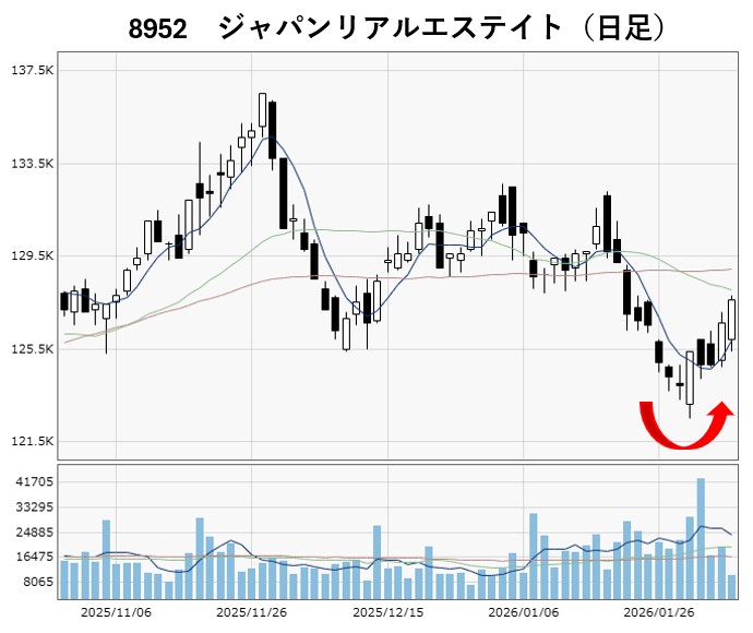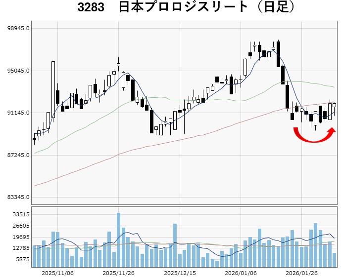 個別銘柄を見ても、REIT指数と同様、1月中旬以降に大きく下げ、足元では売り圧力が和らいでいる銘柄がいくつかあります。ここでは、ジャパンリアルエステイト(8952)、日本プロロジスリート(3283)、日本都市ファンド(8953)のチャートを載せています。
