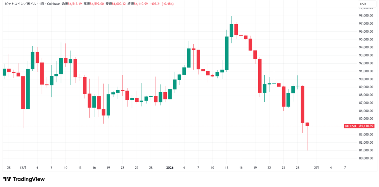 2026年1月のBTCは月初の約87500ドルから、月末には約78600ドルまで下落しました。月末にかけては貴金属市場の急変に連動する形で、暗号資産市場でも売り圧力が強まり、下落が加速しました。