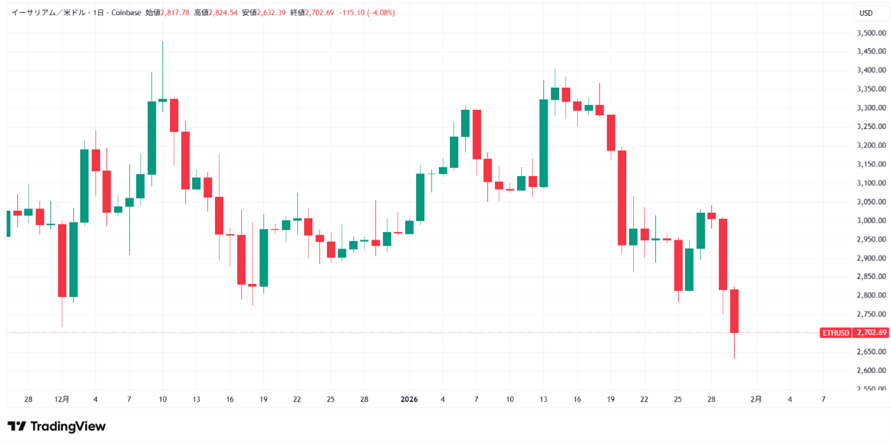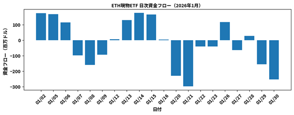 ETHの現物ETFも、1月合計で約3.5億ドルの流出超でした。月半ばにかけては一定の資金流入が確認されましたが、21日や29・30日には大口の流出がみられました。