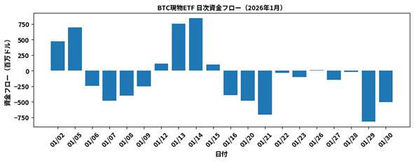 BTC現物ETFは、1月合計で約16.1億ドルの流出超となりました。13日から15日にかけては一定の資金流入が確認された一方、29・30日には大口の流出がみられました。