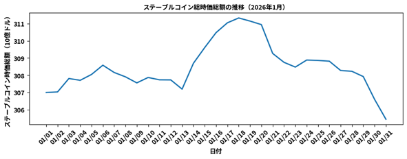 ステーブルコインの総供給量は、月初めの約3070億ドルから月末には約3054億ドルへと小幅に減少し、全体としては概ね横ばい圏で推移しました。市場が調整局面にあるなかでも、オンチェーン上の待機資金が大きく減少していない点は、流動性環境が一定水準で維持されていることを示しています。