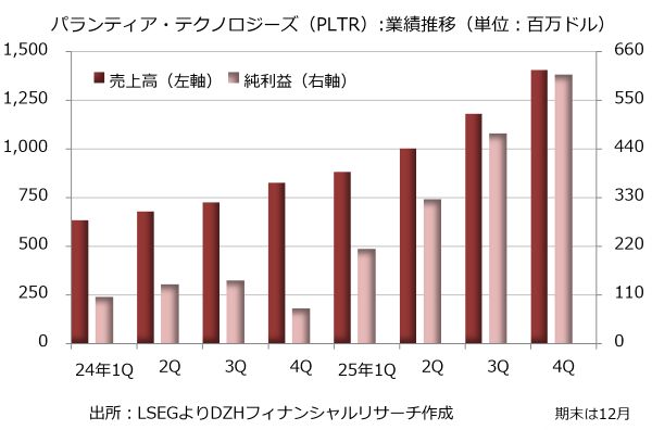 一方、2025年12月通期決算は売上高が前年比56%増の44億7500万ドル、純利益が3.5倍の16億2500万ドルでした。やはり米国事業が成長し、売上高は75%増の33億2000万ドルです。内訳は政府部門が55%増の18億5500万ドル、民間部門が109%増の14億6500万ドルで、やはり民間部門がけん引役になっています。