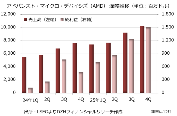 ハイパースケーラー各社が人工知能(AI)開発の手を緩めず、データセンターへの重点投資を継続しているという市場環境が好業績につながりました。データセンター部門の売上高は39%増の53億8000万ドル、営業利益は51%増の17億5200万ドルと大幅な増収増益です。データセンターで使う中央処理装置(CPU)「AMD EPYC」や「AMD Instinct GPU」に対する力強い需要が業績を押し上げました。