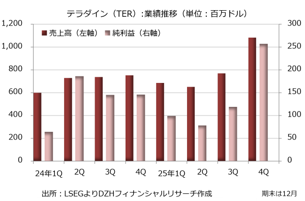 テラダインは、半導体チップの性能や品質を検査する自動テスト装置に加え、協働ロボットや自律移動ロボットなどの開発を手掛けています。事業別の売上高では主力の半導体テスト装置部門が57%増の8億8300万ドルと全体を押し上げる半面、ロボット部門は9%減の8900万ドルにとどまっています。