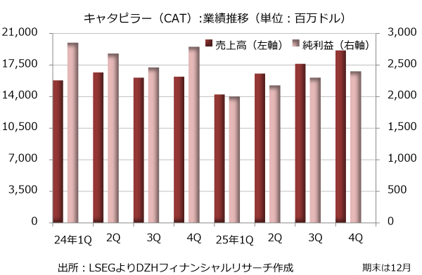 建設機械の世界的な大手、キャタピラー(CAT)が発表した2025年10-12月期決算は売上高が前年同期比18%増の191億3300万ドル、純利益が14%減の24億200万ドルでした。調整後EPS(1株利益)は5.16ドルで、LSEGがまとめた市場予想の4.676ドルを10.4%上回っています。