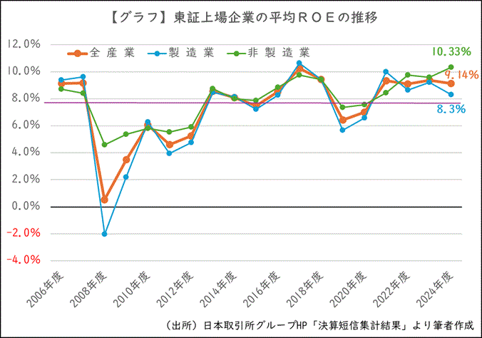 投資家としては、ROEの数値を単独で眺めるだけでは資本効率の良しあしは判断できません。ROEを同業他社と比較したり、自社のROEの推移を確認したりして、経営状況の分析や戦略立案に活用します。【グラフ】は東証上場企業を製造業と非製造業に分けたROE平均ですが、東証は業界平均のROEも公表しています。