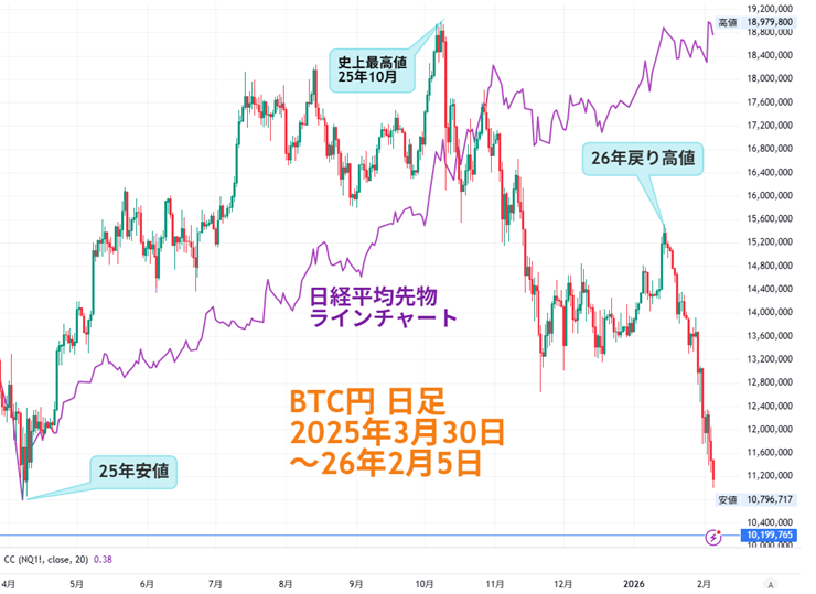 2025年4月以来の1200万円割れで落ち着くかに見えたものの、戻り幅は限られました。2月に入り伸び悩む展開が続くなか、執筆時点では1100万円まで下げ幅を広げています。10月に記録した最高値から約42%下げ、2025年安値1079万円台が完全に視野に入ってきました。
