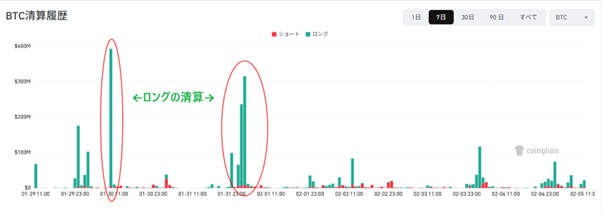 暗号資産分析サイトcoinglassでは、先物市場の清算規模がグラフで確認できます。BTCの履歴をみても、1月30日と31日に突出してロングの強制ロスカットが多かったことが分かります。