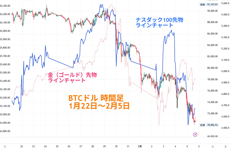 また、先月末には銀先物の暴落をきっかけとした貴金属相場の急落で、市場全般のリスクセンチメントが悪化しました。金や銀の下落に対してビットコインは受け皿とならず、逆に下方向に引きずられました。