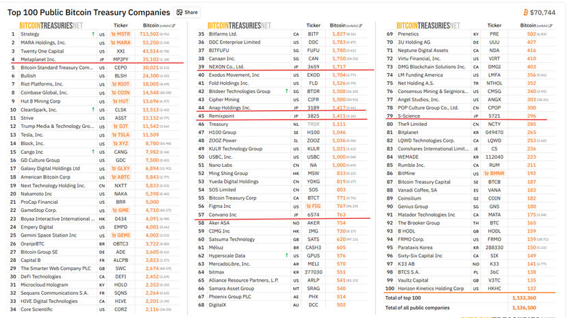 以下がビットコイン財務戦略を実施している企業、保有量トップ100です。