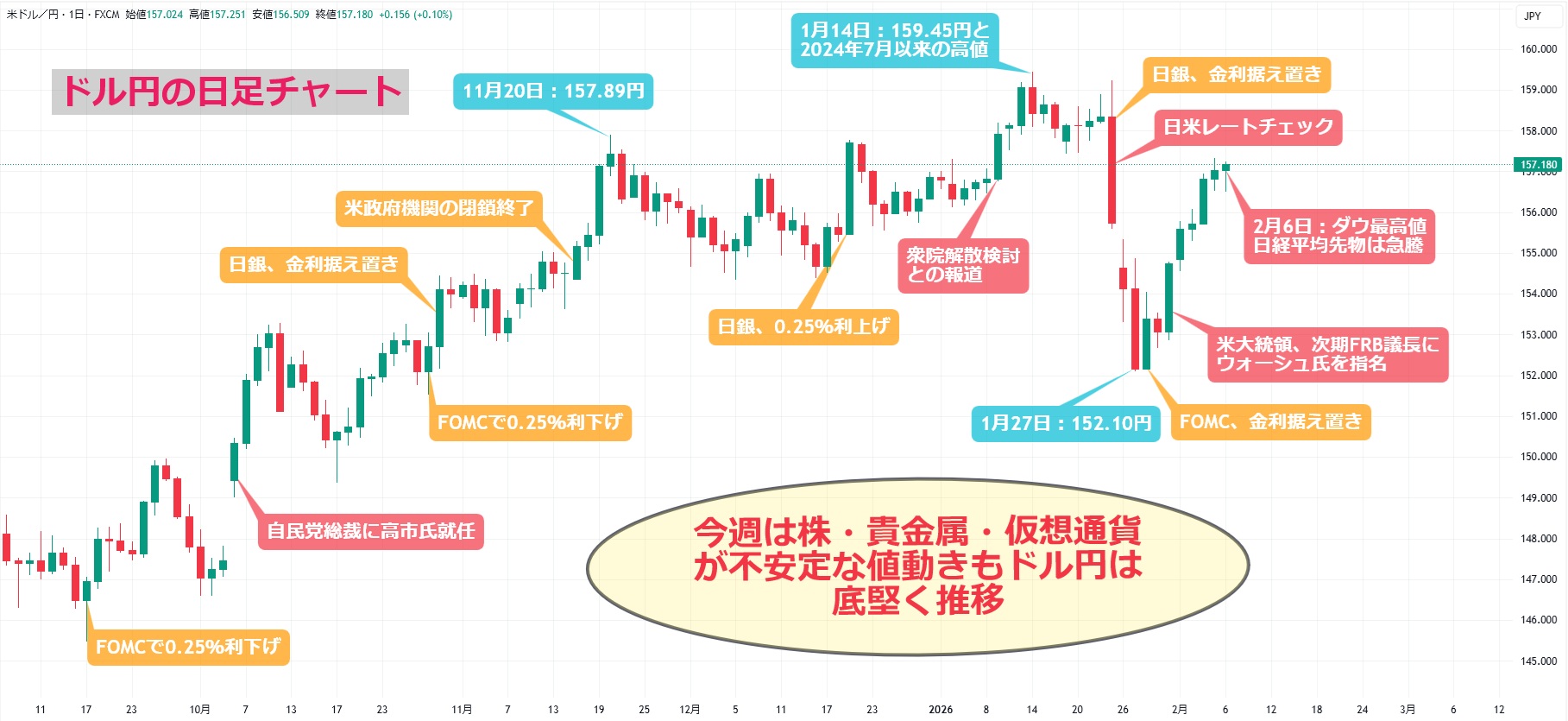 1月23日の「米財務省の指示で米連邦準備理事会(FRB)が『レートチェック』を行った」との報道をきっかけとした売りで、ドル円は27日に152.10円と昨年10月29日以来の安値を付けていましたが、そのあとは戻りを試す展開が続きました。今週も金(ゴールド)や銀(シルバー)など貴金属相場やビットコインの下落が止まらず、週末のアジア市場までは「リスク・オフ」の様相が強まっていました。ただ、ドル円は「ドル高」と「円安」が交互に進む展開となり、終わってみれば6日続伸。157円台で週末の取引を終えています。