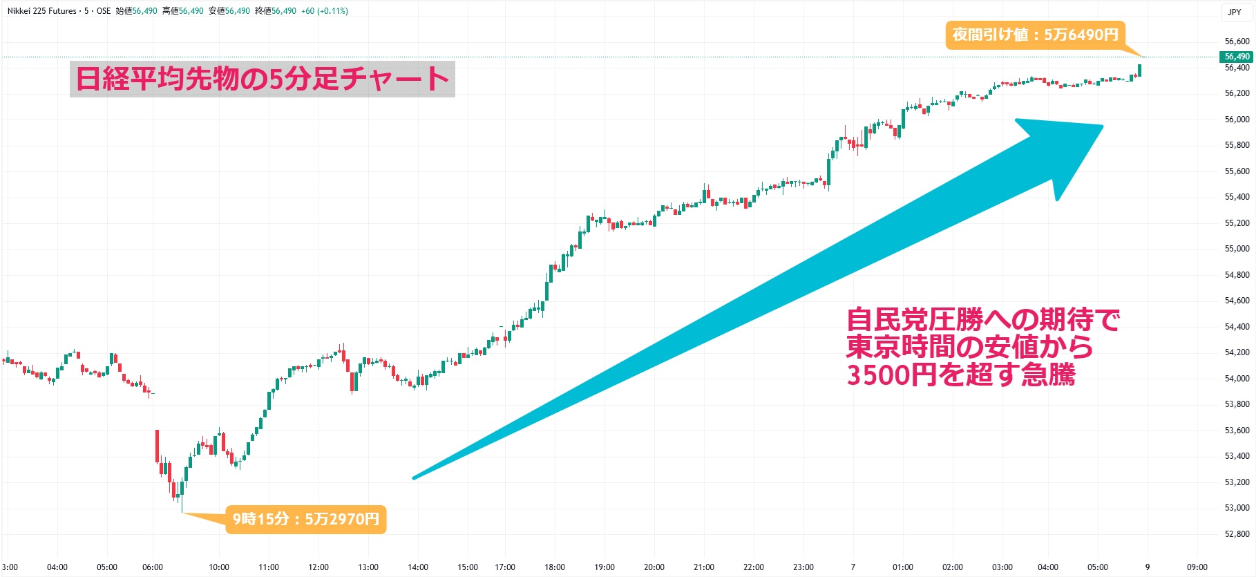 ただ、すでに株買い・円売り・債券売りという「高市トレード」は加速しており、市場では「相場には相当程度、織り込まれている」との慎重な見方もあります。夜間取引の日経平均先物も見ると、大証終値比2080円高の5万6490円となっており、私も「相当織り込まれている」印象を受けます。一方で、「近年は国政選挙の結果と事前予測の誤差が目立つとあって、投票日翌日までは積極的な売買を控える投資家が増えている」との指摘も。「選挙結果を確認してから買い出動する海外投資家もいるため、上値余地は見込める」といいます。