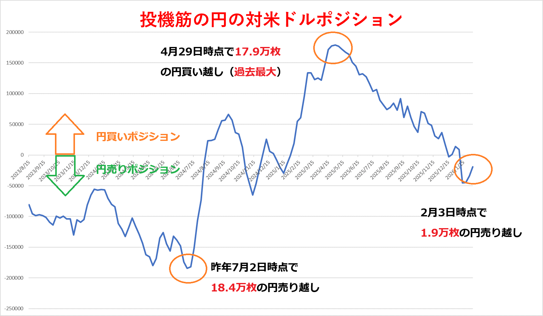 投機筋の円のポジションは昨年7月2日には18万4223枚の円売り越し(ドル円のロング)となり、2007年6月(18万8077枚)以来の高水準を記録していましたが、そのあとは一転して円買いポジションを構築する動きが優勢となり、4月29日には17万9212枚と過去最大を更新しています。ただ、それ以降はその動きが反転し、再び円売りポジションが傾いています。もっとも、1月27日の安値152.10円から戻り歩調が続いているにもかかわらず、2月3日時点では円売りポジションが縮小しており、投機的な動きは確認できていません。