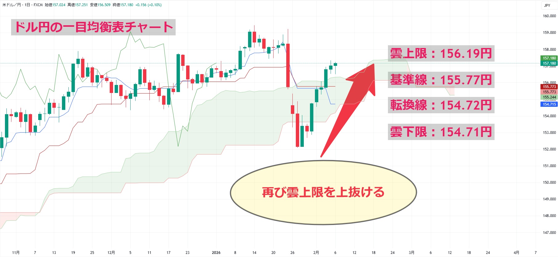 ドル円の一目均衡表チャートを見ると、週末の終値(157.22円)で雲の下限(154.71円)や雲の上限(156.19円)、基準線(155.77円)、転換線(154.72円)を再び上回っています。いったんはこれら全て下回りましたが、1月27日の152.10円でひとまず底を確認。今後はテクニカル的にも買いが入りやすいと言えそうです。