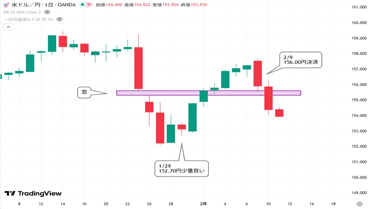 今回に関しては、相場の流れを変わったのを捉えられたのが大きく、その後はチャート上の窓埋めや衆院選での自民大勝期待も相まって流れに乗れたのが、勝因といえます。ただ、157円台で決済できなかったのは心残りであり、156円を待たずもう少し早めに決済の決断ができれば、なおよかったのかとも思いました。