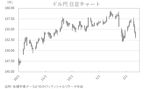 東京休場前の2月10日には日経平均株価は史上最高値圏の5万8000円台をうかがう場面もありましたが、ドル円は伸び悩み、翌11日のアジア時間には152円台まで一気に調整しました。短期間で円安が進んだ反動に加え、米金利の低下を受けたドル売りや、テクニカル要因による売りが重なったとみられます。もし株価にも調整が入れば、円の買い戻しがさらに加速するリスクもあります。