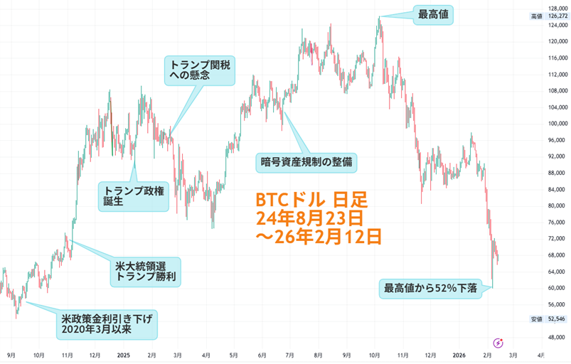 代表的な暗号資産のビットコイン(BTC)は2026年2月12日13時頃、対円では1033万円前後と前週(7日前)比で約7.5%低い水準で取引されています。BTCドルは6万7400ドル付近と、年初来で22%ほど下落した水準です。