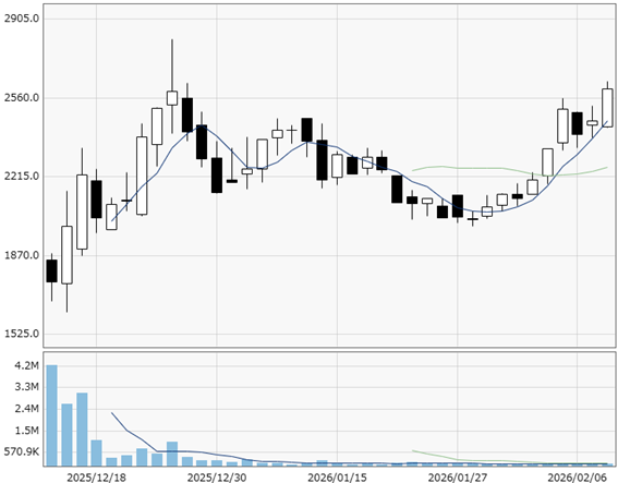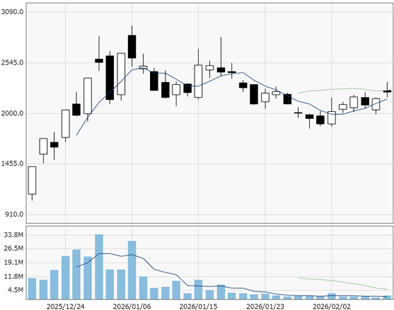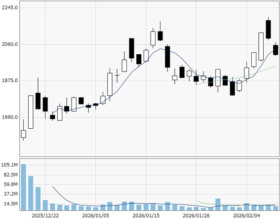 その後は売りに押されますが2000円の大台は死守。2026年2月に入り、2000円台半ばまで上昇しており、上場来高値が視野に入っています。