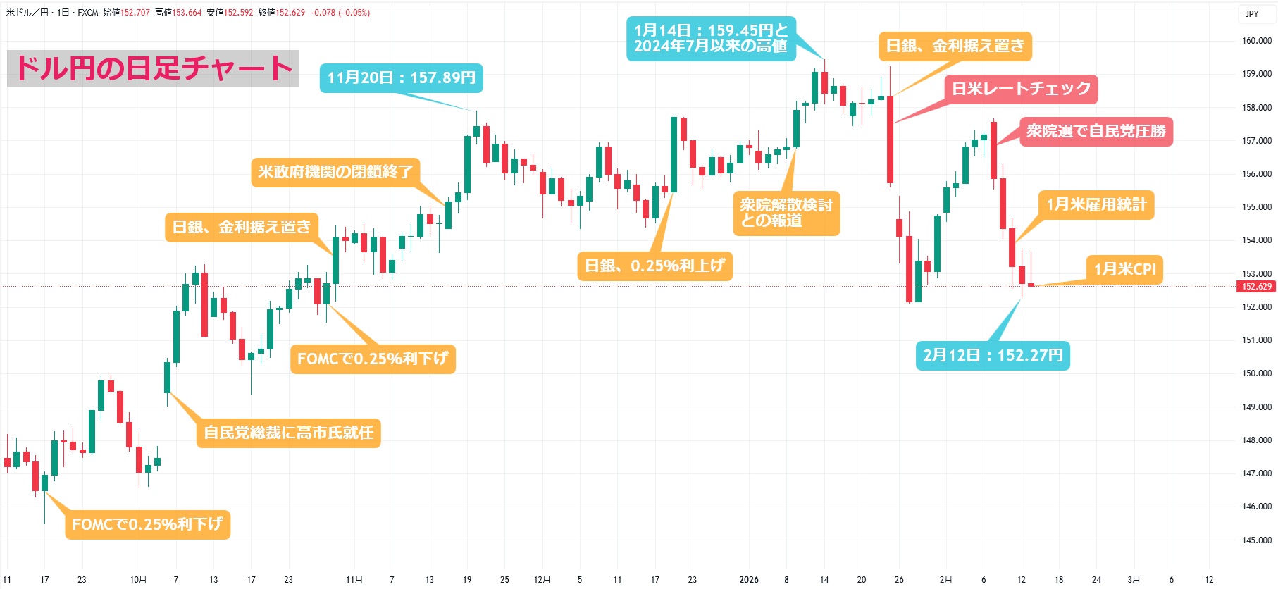 また、米労働省が11日発表した1月米雇用統計では非農業部門雇用者数が13.0万人増と予想の7.0万人増を上回り、失業率が4.3%と予想の4.4%より強い結果となったにもかかわらず、ドル円の上昇は一時的(瞬間的!?)。米景気への警戒感は根強くドル買いは続かなかったこともありますが、主な理由は「衆議院選挙での自民党圧勝を受けて、高市政権が財政規律に配慮するのではとの観測から円買いが入りやすい」との見方も。12日の東京市場では152.27円まで値を下げています。
