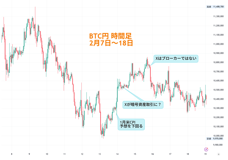 1月米消費者物価指数(CPI)が市場予想を下回る伸び率となり、米長期金利の低下がリスク資産の支えとなったようです。また、Xが「数週間以内」に暗号資産および株式取引を開始予定、とのニュースもBTC買い戻しに繋がりました。