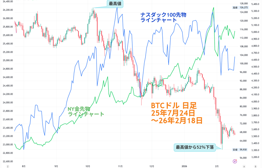 Xを所有するマスク氏からBTC相場へのバレンタインデー・プレゼントに思われましたが、BTC円は1089万円前後、BTCドルが7万1000ドル手前まで上昇したところから失速します。Xプロダクト責任者が「Xは取引執行やブローカー業務を行わず、金融データと取引業者リンクの提供のみを行う」と述べたことが失望売りを呼びました。