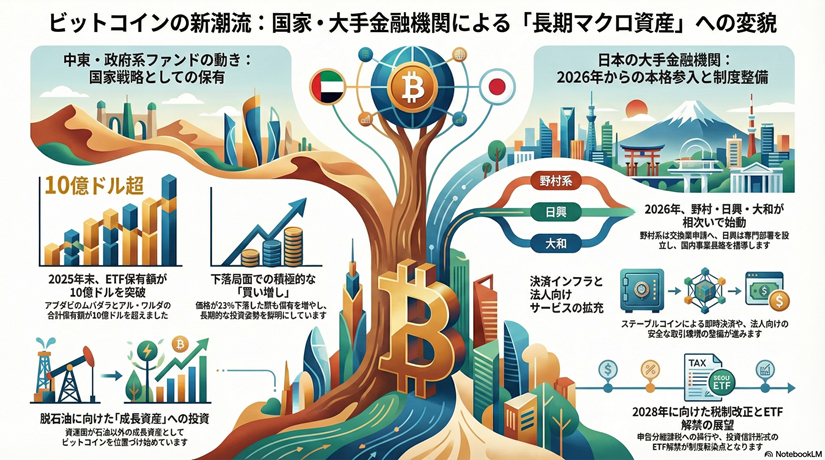政府系ファンドが下落局面でビットコインETFを10億ドル規模で保有していた事実は、暗号資産が国家レベルの長期ポートフォリオに組み込まれつつあることを示しています。特に資源国であるアブダビが、石油以外の成長資産としてビットコインを位置づけ始めている点は象徴的です。