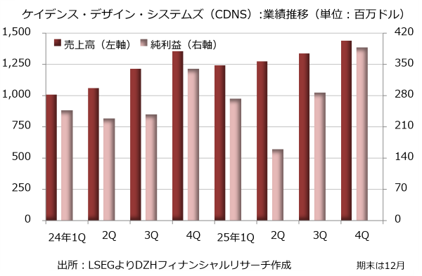 人工知能(AI)コンピューティングに使う新たなチップ開発への需要が高まる中、EDAツールの開発会社として業績を伸ばしています。顧客にはエヌビディア(NVDA)やアップル(AAPL)、台湾セミコンダクター・マニュファクチャリング(TSM)が名を連ねており、AI半導体投資の活発化で恩恵を受けているようです。