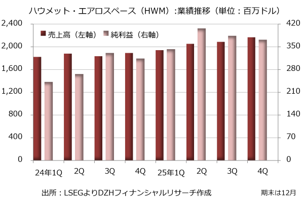 エンジン部品などの開発と製造を手掛けるハウメット・エアロスペース(HWM)が発表した2025年10-12月期決算は売上高が前年同期比15%増の21億6800万ドル、純利益が18%増の3億7200万ドルでした。調整後EPS(1株利益)は1.05ドルで、LSEGがまとめた市場予想の0.966ドルを8.7%上回っています。