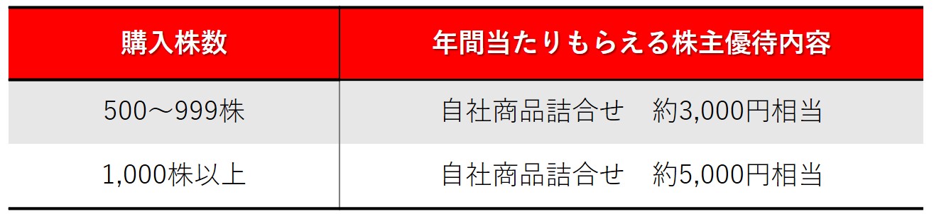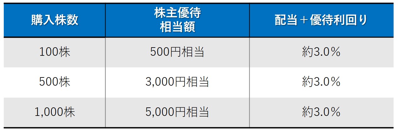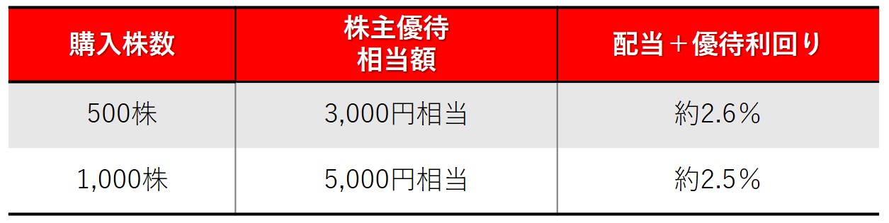 1株1300円で500株購入した場合、投資金額は65万円です。配当金は1万4000円なので、配当利回りは約2.2%になります。また、株主優待として約3000円相当の自社商品詰合せが贈呈されるため、優待利回りは約0.5%、配当と優待を合わせた利回りは約2.6%です。