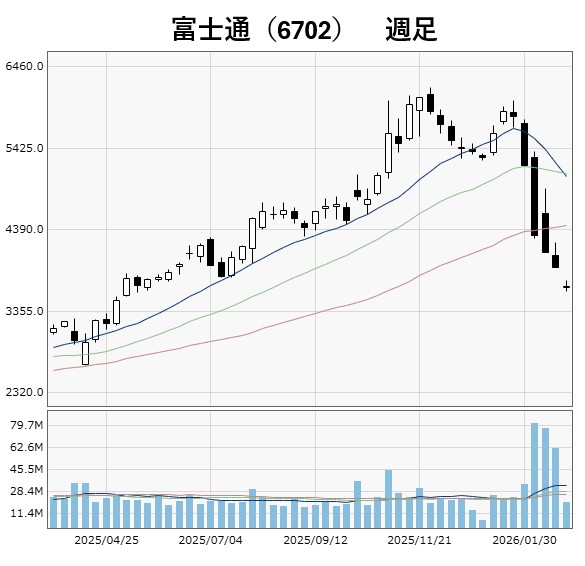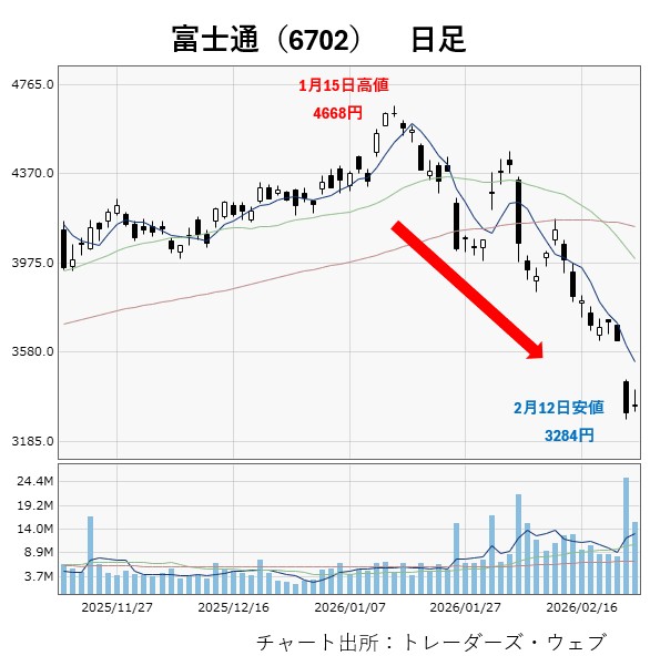 富士通はIT・サービス分野の大手ですが、今の株式市場ではこの手の銘柄がかなり嫌われています。AI(人工知能)の進化がソフトウェア関連企業の事業機会を奪うとの警戒が広がったことが売り材料となっています。アメリカで新興AI開発企業が新機能についてのリリースを出すと、米国のソフトウェア関連株が大きく下げ、日本の関連株も連れ安するといった負の連鎖が発生しています。