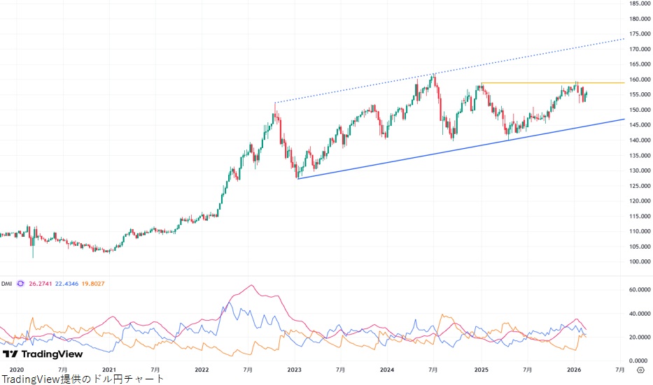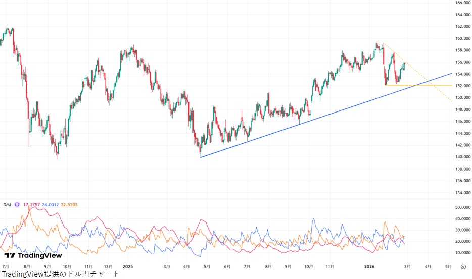 今回解説していく通貨はドル円(usd/jpy)です。上昇トレンドが継続中であることは間違いなさそうですが、中期的にはダブルトップ、短期的には三角保ち合いと今後の調整を意識させる推移となっている点は気掛かりです。ファンダメンタルズ面ではパウエル米連邦準備理事会(FRB)議長の任期満了が近づいています。後任のウォーシュ氏によって米国の金融政策が変化する可能性もあり、今後も注意が必要となるでしょう。