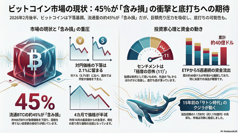 暗号資産分析会社グラスノードのデータでは、2月初めから取得価格を上回る売却より、下回る売却(つまり損切り)が多かったことが示されています。こうした損失確定が、将来の買い手を市場から遠ざけていると記事では指摘されていました。