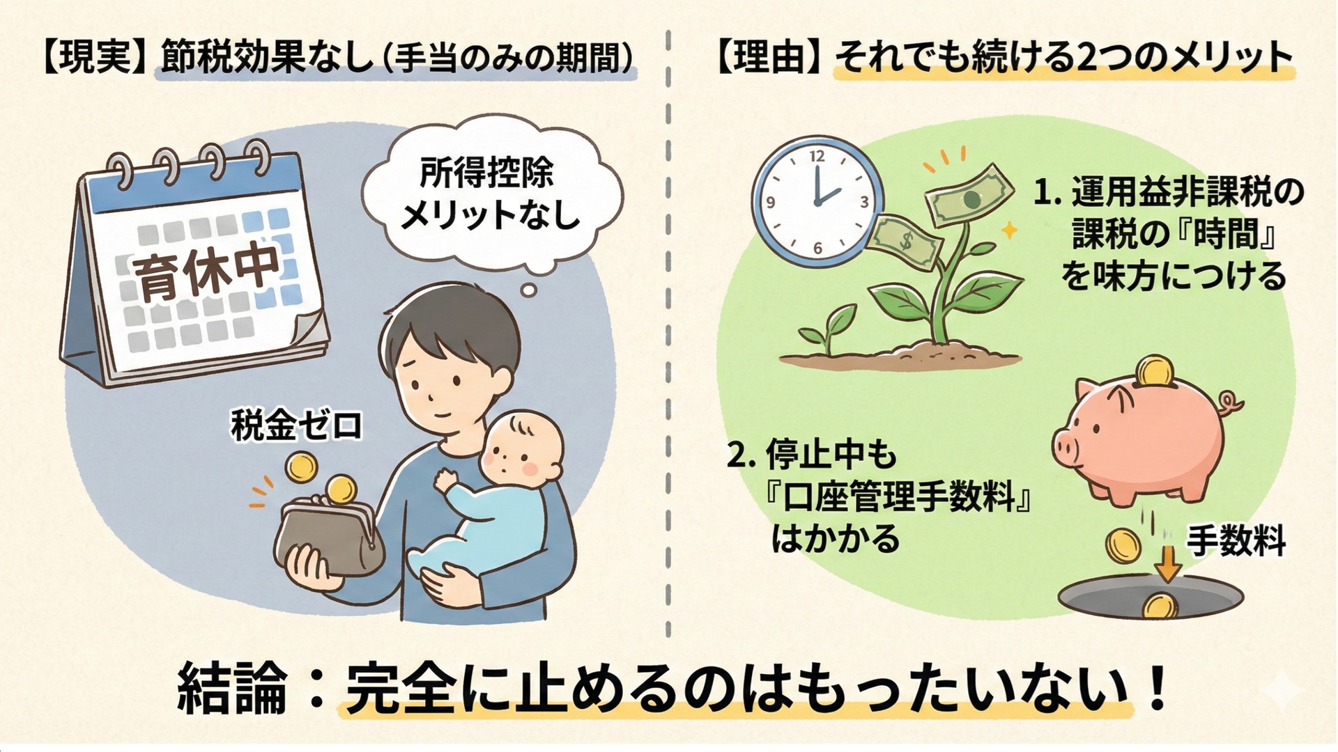 つまり、育休手当だけで生活している場合、そもそも払う税金がないため、iDeCoによる節税メリットはゼロになります。これが「育休中はiDeCoが無駄になる」と言われる理由です。