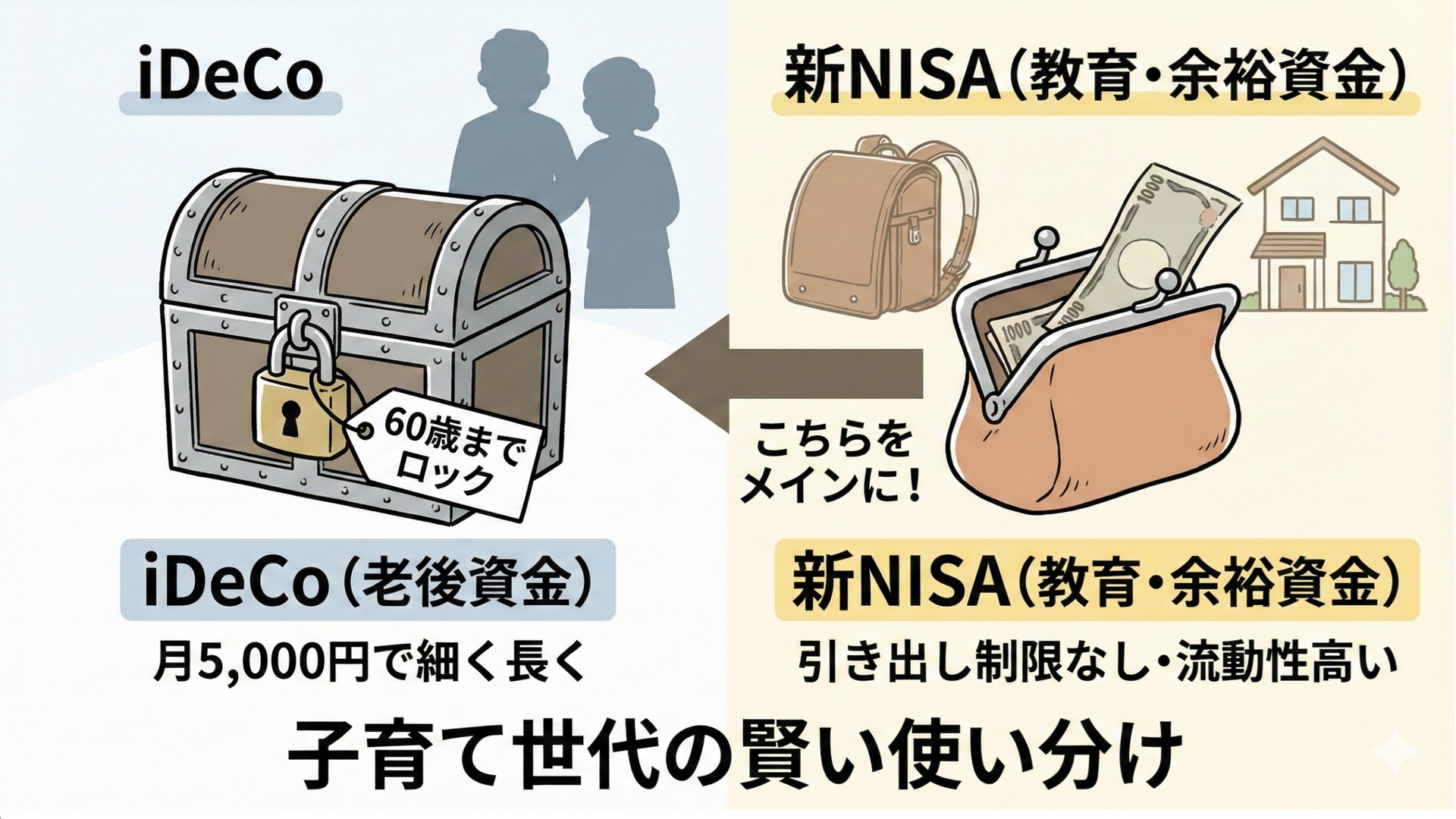 「iDeCoで節税しなきゃ!」と無理をして資金をロックしてしまうと、いざ出費が必要となる時期に困ります。流動性の高いNISAをメインにしつつ、iDeCoは最低限のペースで活用するのが子育て世代の資産運用です。