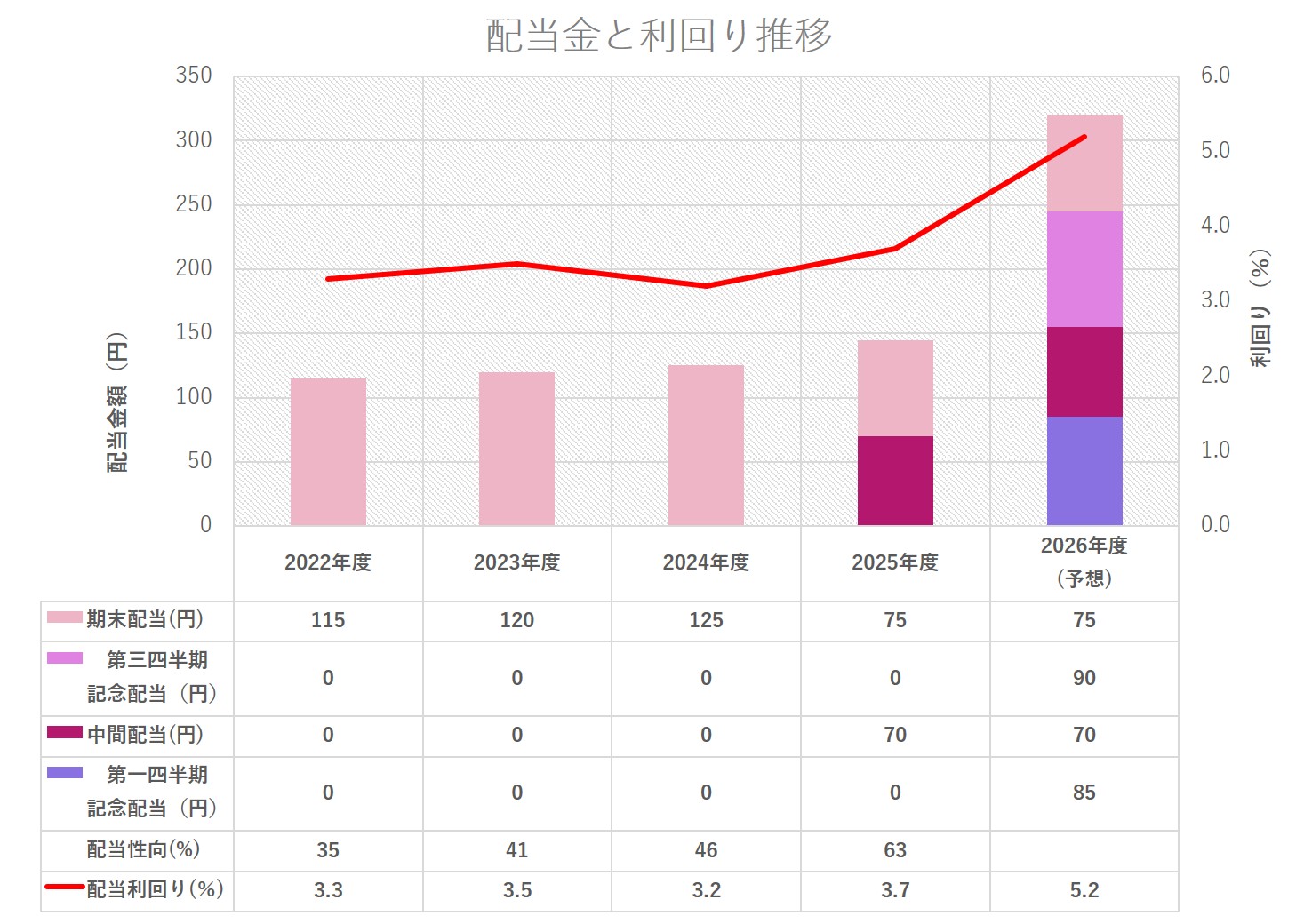 2026年度の配当金は、6月末の記念配当で85円、9月末の中間配当で70円、12月末の記念配当で90円、3月末の期末配当で75円の、年間1株当たり320円となる予想です。この金額は、2020年度の85円、2021年度の105円、2022年度の115円、2023年度の120円、2024年度の125円、2025年度の145円から6期連続で増配しています。