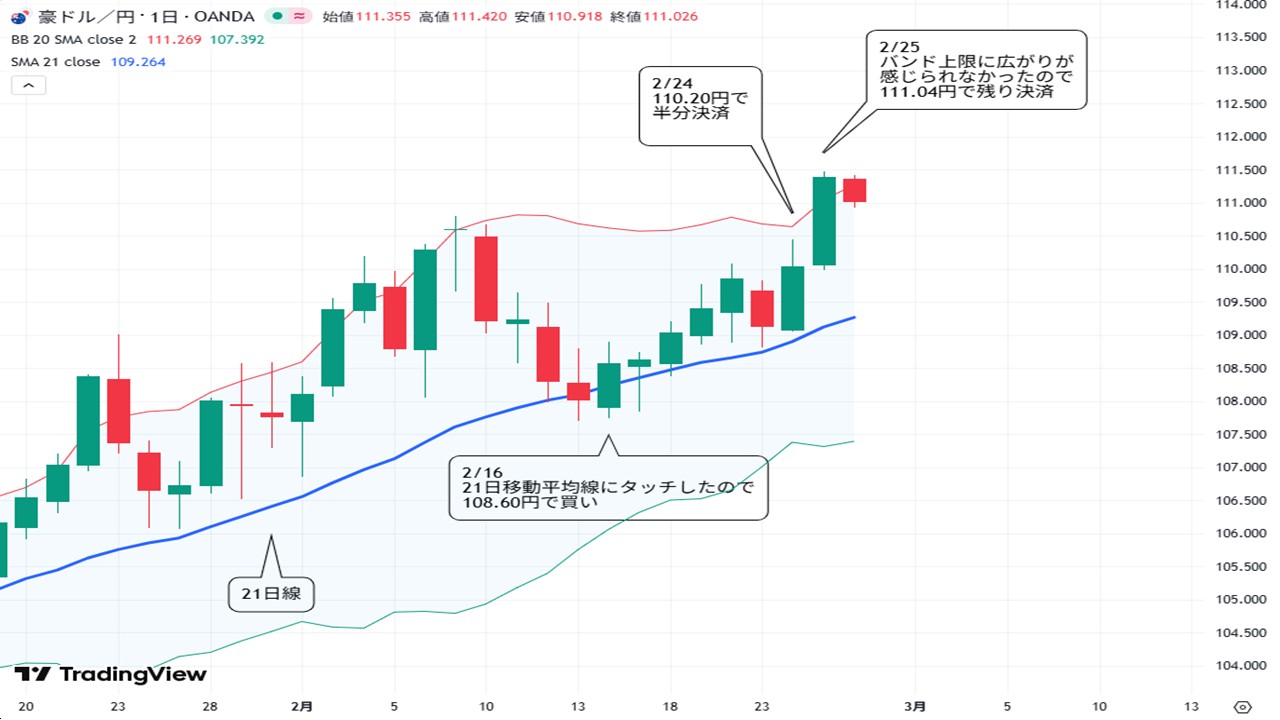 さて話を戻しますと、豪ドル円はその後108円を割り込む場面もありましたがストップの水準には到達せず。ドル円が156円台に上昇する中で、豪ドル円もつれて111円台に乗せてきました。その途中の110.20円で部分利確しつつ、111円台に乗せる動きとなってもボリンジャーバンドの+2σ上限が広がらなかったのを見て、残りも111.04円で利益確定しました。